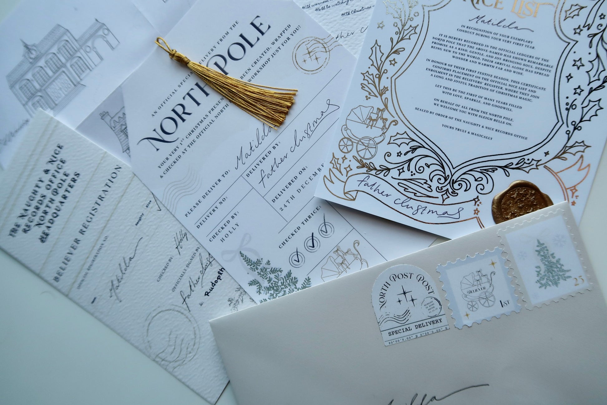 The set also includes a Letter from Father Christmas or Santa Claus, complete with an official gold foil seal and personally named and signed, an a never been seen before Official Believers Registration Card to mark their entry onto the Register, a Stocking Tag, and a Top Secret North Pole Map — said to have been dropped by the Elves themselves.